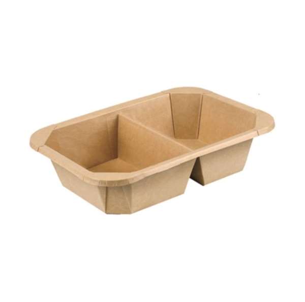 Récipient en carton kraft naturel avec revêtement intérieur en PE 300 + 18 g/m², idéal pour des présentations soignées dans les services de restauration à emporter, le catering ou la restauration collective. Il dispose de deux compartiments séparés qui permettent de maintenir différents aliments à leur place, évitant ainsi le mélange des saveurs ou des textures.